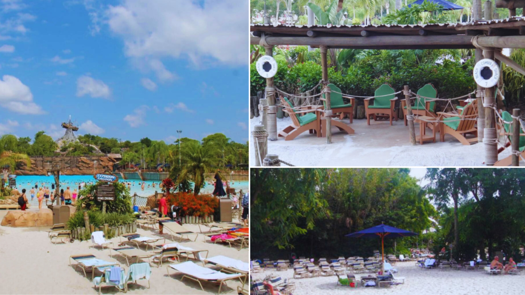 Por todo o parque você irá encontrar cabanas, espreguiçadeiras e guarda sóis espalhados. Porém alguns você terá que alugar e em outros você pode se acomodar gratuitamente. Para um grupo que deseja usufruir de um conforto e privacidade, saiba que o parque oferece a locação das cabanas Beachcomber Shacks, que abrigam até 6 pessoas e já incluem armários, um cooler com garrafas de água, toalhas a vontade, canecas com refil e até um serviço de garçom durante todo o dia. O valor para o aluguel varia entre $300 a $600 dólares (bem caro, na nossa humilde opinião).